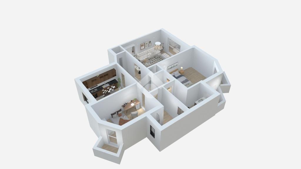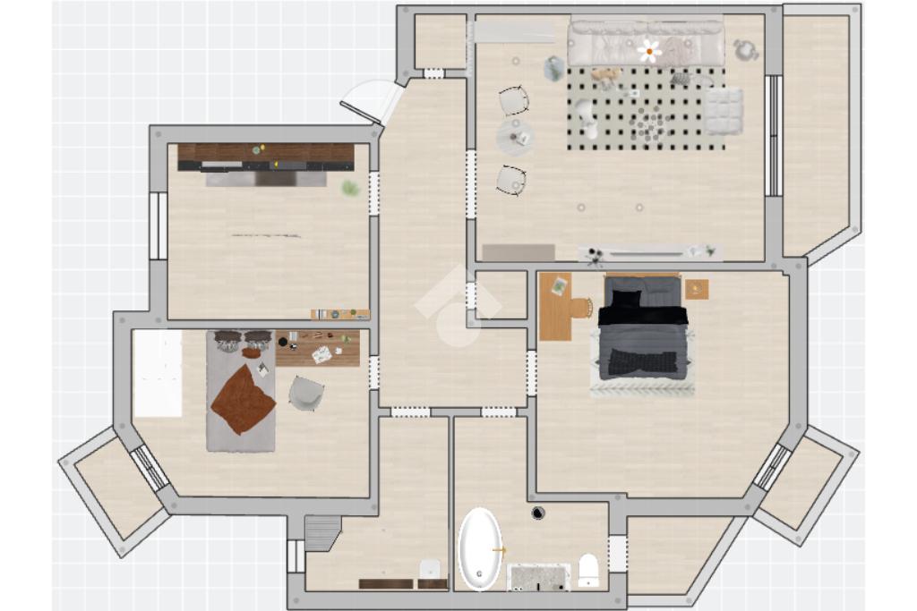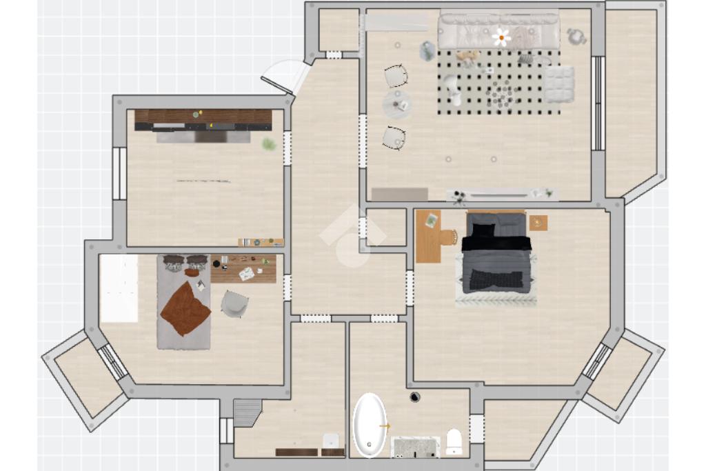 Dall'ingresso si accede al soggiorno, che affaccia su un balcone, mentre adiacente si trova la cucina abitabile, anch'essa con balcone. Nel disimpegno è presente un comodo ripostiglio. Un piccolo disimpegno separa la zona giorno dalla zona notte, dove troviamo le due camere da letto, entrambe servite da un balcone, un ripostiglio e due bagni finestrati, entrambi con balcone.
