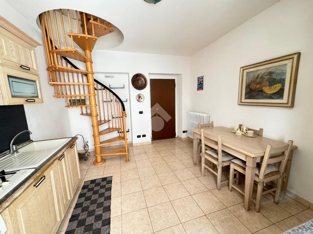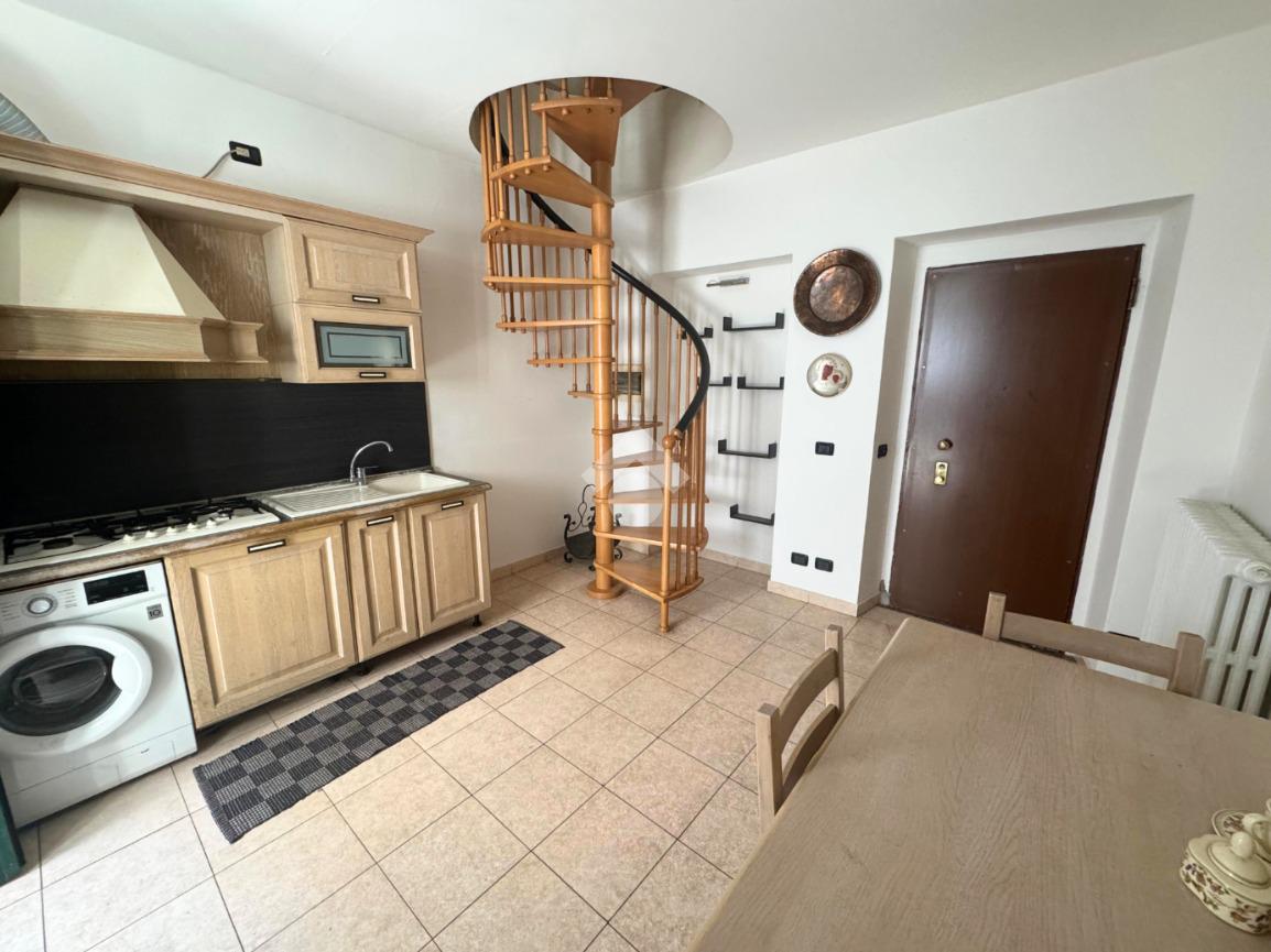 L’ingresso si apre su un’ampia cucina abitabile, caratterizzata da spazi ben distribuiti e doppio accesso. La scala a chiocciola conduce al piano superiore, dove troviamo un luminoso soggiorno con balconcino, il bagno finestrato con doccia e una camera da letto di generose dimensioni. Gli ambienti risultano ben organizzati e valorizzati dalla buona luminosità.